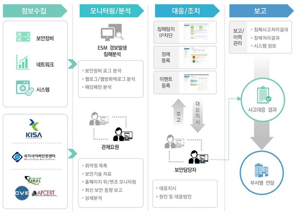 보안 관제의 업무 절차를 보여주는 이미지입니다. 업무 절차는 정보 수집, 모니터링 및 분석, 대응 및 조치, 보고 로 이루어집니다. 정보 수집 단계에서 먼저 보안 관제를 맡고 있는 곳을 점검하여 보안 장비의 상태, 고객 기업의 네트워크 현황, 시스템 현황 등을 파악하여 사이버 공격 흔적 등을 탐지합니다. 그리고 KISA, 국가 사이버 안전 센터등의 홈페이지를 탐색하여 새로운 유형의 공격이나 현재 유행하고 있는 유형의 사이버 공격 등의 정보를 탐색하여 정리합니다.