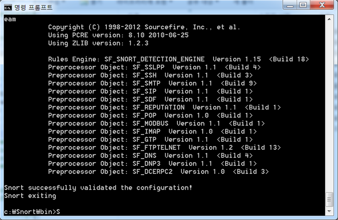 설정이 완료되었다면, 스노트가 작동하는지 테스트할 시간입니다. 명령 프롬프트를 실행하고 다음 명령어를 순서대로 입력한다면 테스트가 진행됩니다.
