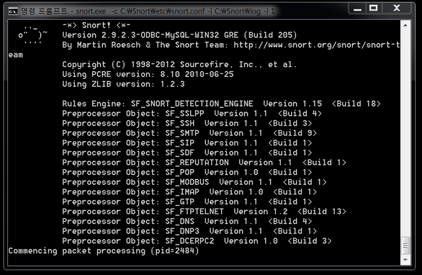 만약 테스트가 정상적으로 완료되었다면 "-T"부분을 제외한 명령어를 입력한다면 스노트가 작동하기 시작합니다. 다음과 같습니다