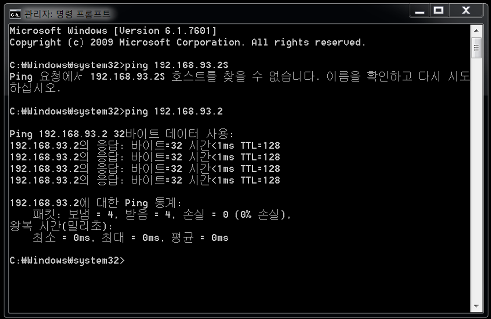 같은 네트워크에 있는 다른 가상 머신을 이용하여 Ping 메세지 입력
