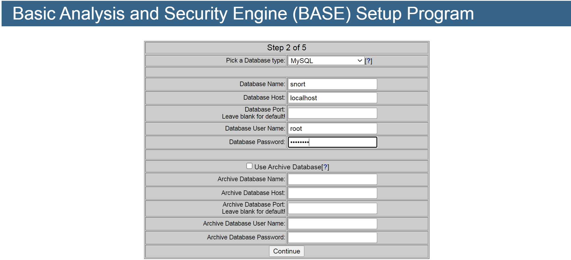 사용할 데이터베이스는 MySQL이고 그 아래에 DB이름과 호스트 이름, 사용자 이름과 비밀번호를 설정하시면 됩니다. 포트설정은 기본설정대로 사용할 것이기 때문에 공란으로 두고 아래에 있는 아카이브 설정은 사용하지 않을 것이기 때문에 공란으로 둡니다. 그리고 Continue를 눌러 진행합니다.