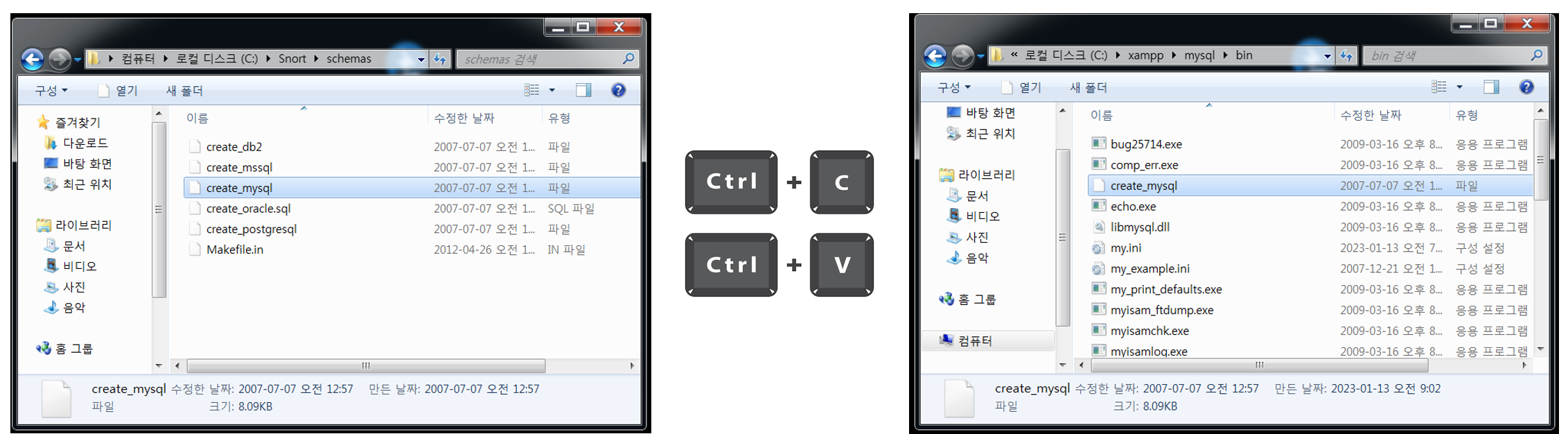 우선 작업 편의성을 위하여 스노트 폴더 안에 있는 Schemas 파일(create_mysql)을 MySQL 폴더 내에 복사합니다.