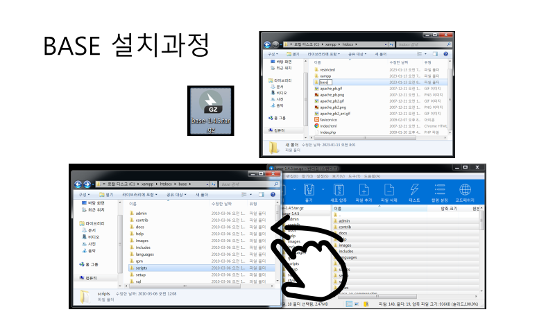 htdocs 폴더안에 기본적으로 base폴더가 없기 때문에 base폴더를 생성하고 해당 폴더에 압축을 해제하면 됩니다.