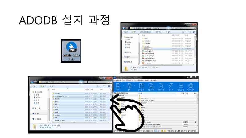 마찬가지로 htdocs 폴더 안에 adodb5폴더가 없기 때문에 새로 생성하고 해당 폴더에 압축 해제를 하면 됩니다.