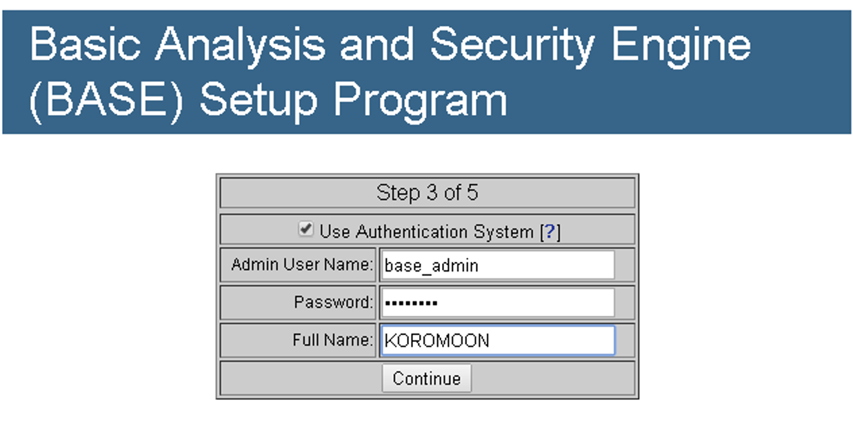 이제 로그인 정보를 생성할 것 입니다. 사용할 아이디와 패스워드, 사용자 이름 등을 설정하고 Continue를 눌러 진행합니다.