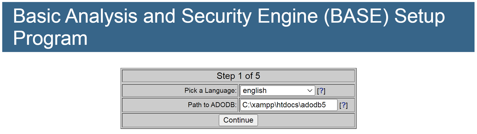 언어는 영어로 설정하고, ADODB를 설치한 경로를 찾아 입력합니다. Continue를 눌러 진행합니다.