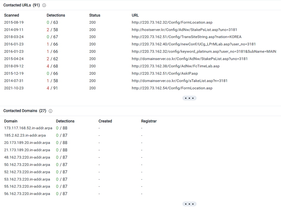 바이러스토탈의 Relation(관계) 탭입니다. 해당 탭을 분석한 결과 다음과 같은 특징을 관찰할 수 있었습니다.