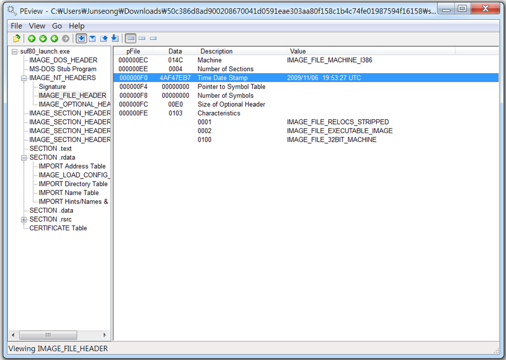 그 다음은 PEVIEW를 이용한 분석을 하겠습니다. 파일 제작시간은 바이러스 토탈에서 본것과 같은시간이 적혀 있었습니다.