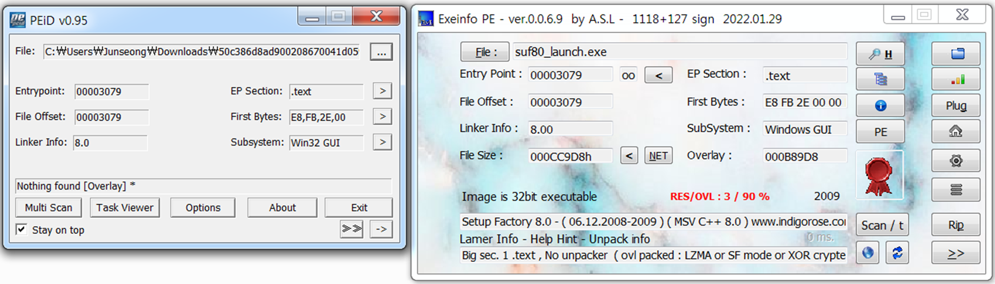 가장 먼저 PEID와 EXEINFO의 검사 결과입니다. 이전에 악성코드 선별에서 패킹되지 않은 악성코드를 선별하였기에 패킹되지 않은 악성코드라는 점을 확인할 수 있었습니다. 이처럼 바이러스 토탈에서는 패킹되어 있다고 결과가 나타나지만 실제로는 결과가 다른 경우가 존재하기에 정적 분석 도구를 이용하여 확인하는 작업이 필요합니다.