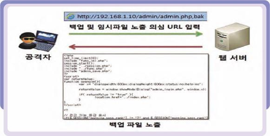 아파치 등의 서버를 설치할 때, 설치중 생성된 임시파일이 삭제되지 않고 잔류하게 될 경우 발생하는 취약점입니다. 이 임시파일들이 노출될 경우 임시파일의 정보를 이용하여 서버의 버전 등 정보를 얻어내고 이를 활용하여 공격 계획을 세우는 등의 문제가 발생할 수 있습니다.