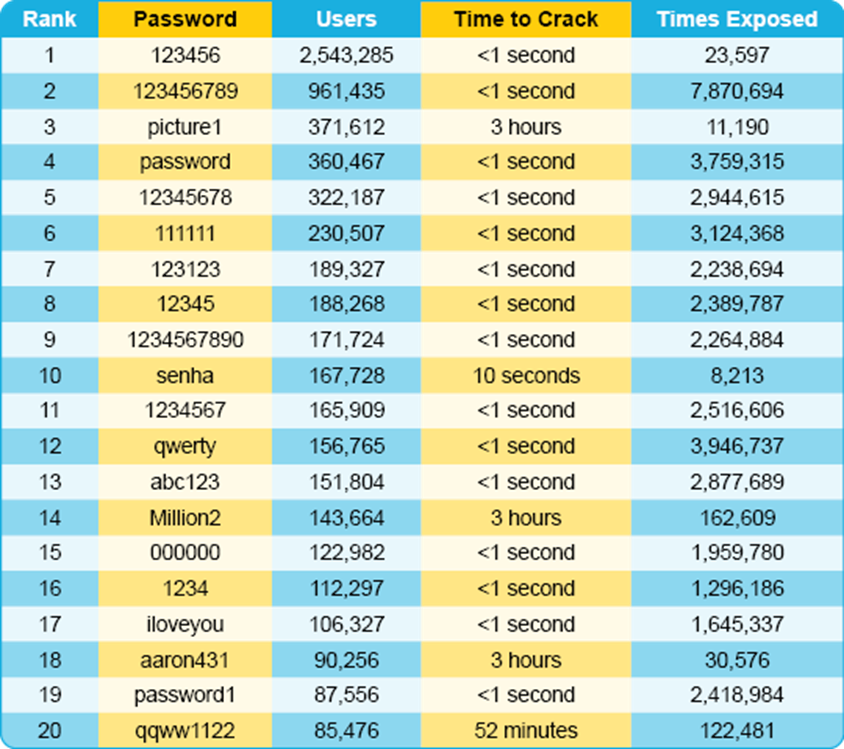 회원 가입을 할 때 패스워드 규칙이 너무 간단하면 생길 수 있는 문제점입니다. 위의 이미지에서 드러나듯이 너무 간단한 비밀번호(123456과 같은)를 설정한다면 브루트 포스 공격에 1초 안에 파훼될 수 있습니다.