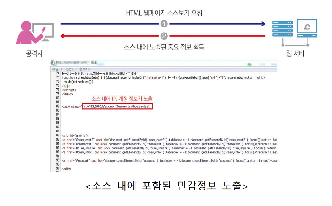 소스 코드 내 중요 정보 노출 취약점이란, 개발 과정에서 편의를 위하여 소스 코드에 남겨둔 중요한 정보를 마무리 과정에서 제거하지 않아 외부로 노출되는 취약점을 말합니다. 이 경우 주로 IP나 관리자 계정 정보 등이 노출되어 커다란 사고로 이어질 수 있습니다.