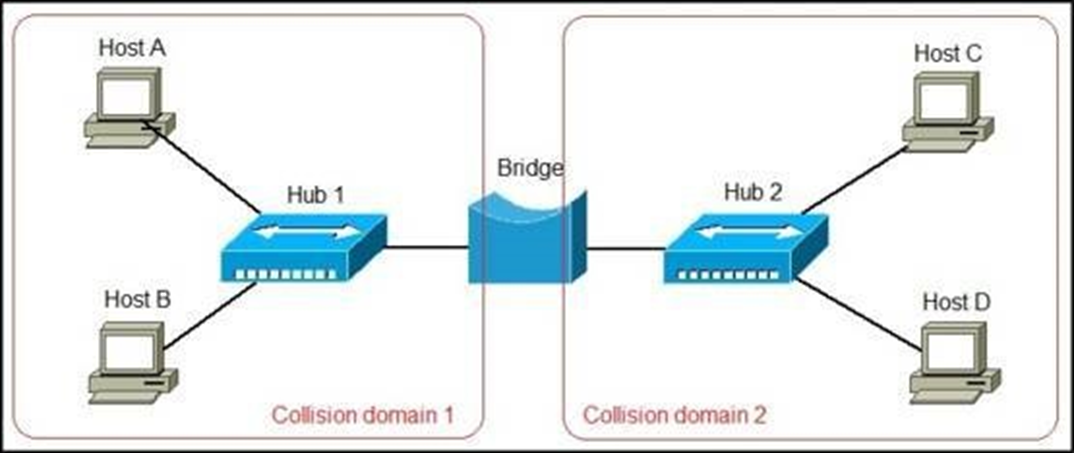 브리지는 허브와 허브를 연결하여 더 큰 네트워크를 만드는 장비입니다. 허브와는 다르게 브리지는 2계층 장비이기에 MAC주소를 이해하는 기능이 있습니다. 그렇기에 허브 1에 있는 컴퓨터 a가 컴퓨터 b와 통신할 때, 브리지는 허브 2로 가는 신호를 차단하고, 컴퓨터 a가 c와 통신하고자 할 때만 허브 2로 신호를 연결해 줍니다. 이런 방식으로 네트워크를 구성하여 충돌 여지가 많은 허브 네트워크의 단점을 보완한 장비라 할 수 있습니다.