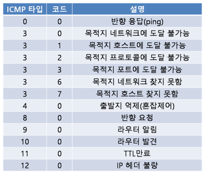 네트워크를 제어하기 위한 기초적인 프로토콜입니다. IP에는 데이터를 목적지로 전송하기만 할뿐 에러 상황에 대한 대책이 존재하지 않습니다. 그렇기에 목적지와 이어지는 케이블이 끊어졌다거나, 시간이 너무 오래걸린다거나 하는 문제가 발생했을 때, 데이터의 출발지로 다시 데이터를 보내 오류상황을 알리는 프로토콜입니다. 오류 메세지에 관련한 이미지를 첨부하여 참고하시기 바랍니다.