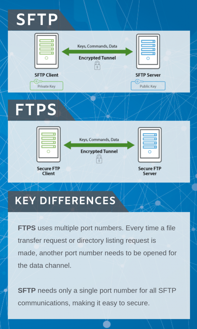 FTPS와 SFTS는 둘 다 파일 전송 프로토콜이면서 보안을 적용한 것입니다. 하지만 차이점이 존재합니다. FTPS는 FTP에 SSL을 이용한 보안 기술을 적용한 것으로 기본적인 특징이 FTP와 같습니다. 하지만 SFTP는 SSH 기술을 이용하여 FTP와 유사한 서비스를 바닥부터 다시 만들어 낸 프로토콜입니다. 그렇기에 SFTP는 FTP의 주요한 특징인 두 가지의 채널로 통신하여 자료를 받는다는 특징이 없습니다.