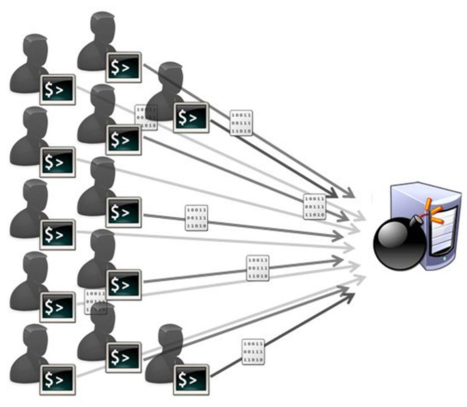 DDoS 공격을 알기 위해서는 먼저 DoS 공격에 대하여 알고 가도록 하겠습니다. DoS 공격이란 Denial of Service attack의 약자로 한국어로 하면 '서비스 거부 공격'입니다. 상대방을 "서비스 거부" 상태에 몰아넣기 위해서 하는 모든 공격들을 통칭힙니다. 그리고 DDoS 공격이란 이런 DoS 공격을 여럿이서 하는 것입니다. DDoS 공격은 종류가 아주 여러 가지가 있지만 이해를 돕기 위하여 가장 원시적인 방식 하나와 일반적인 방식 하나를 예시로 들겠습니다.