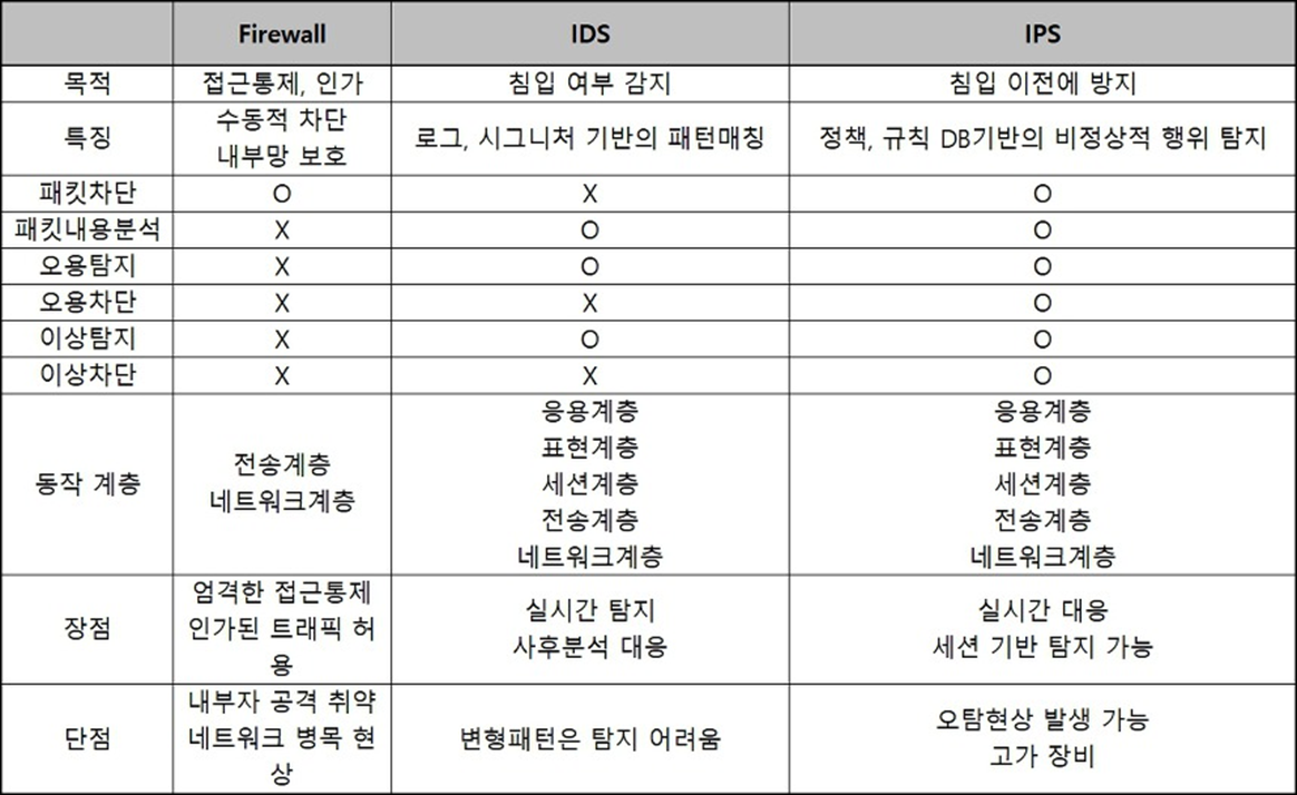 침입 방지 시스템으로 IDS에서 시스템 내부로 공격이 들어왔음을 탐지하는데에서 그치지만 IPS는 시스템 외부에 존재하는 공격을 탐지하고, 역으로 공격을 차단하는 기능을 가지고 있습니다. IDS가 문서화된 공격을 시스템 내부에서 감지한다면, IPS는 규칙과 정책을 기반으로 외부에서 오는 공격을 감지하고 차단합니다. 하지만 매우 고가의 장비가 필요합니다.