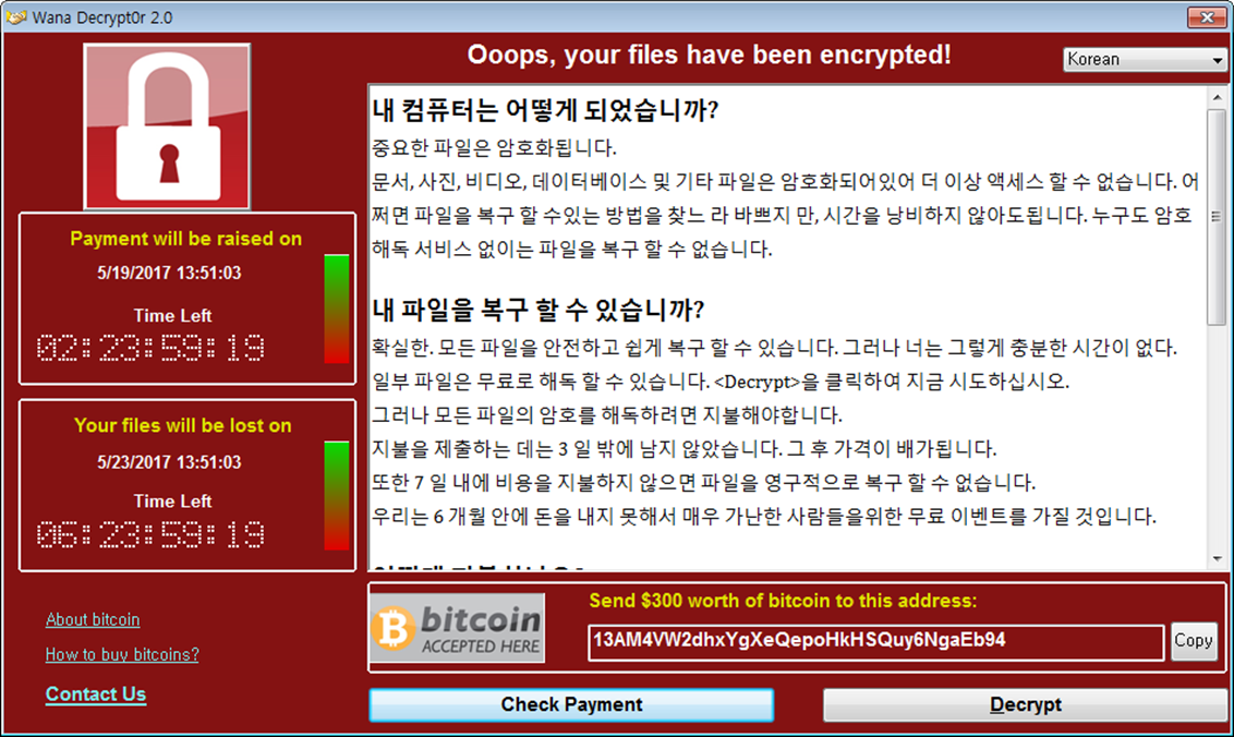 랜섬웨어는 Ransom(인질) + Malware(악성코드)로, 사용자의 파일을 암호화해 인질로 잡고 돈을 요구하는 악성코드입니다. 대표적인 랜섬웨어로는 2017년에 유행했던 워너크라이가 있습니다. 이 랜섬웨어는 피해자 컴퓨터의 파일을 암호화 시키고, 비트코인을 입금해야 파일의 암호화를 풀 수 있는 키 코드를 주겠다고 말하고, 일정 시간이 흐르면 파일을 삭제하겠다고 협박하여 수익을 창출했습니다. 당시 적지 않은 기업들이 이에 돈을 낸 것으로 알려졌습니다.